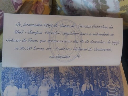 São vinte anos de formatura. Vinte cinco que entramos naquela sala da UnC. Éramos em tantos e nos formamos tão poucos.  Mas entre os que foram até o fim se formou um elo que vibra uma energia que não sabemos explicar. Cada um tomou seu rumo, fez sua própria família, mas manteve contato. O contato que mantém viva uma amizade para durar a vida toda. Poder reunir a maioria, vinte anos depois, é um presente. O estar presente num encontro desses acende a memória, traz lembranças tão gostosas que a gente não quer que acabe mais. Fica a promessa de novos encontros. Fica o desejo que eles se realizem. Fica o amor por cada um deles. Fica a sensação de que foi ontem que a gente se formou”.
